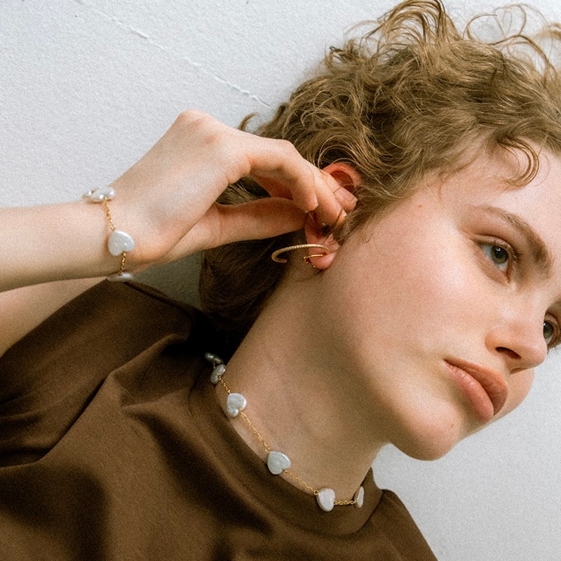 等間隔に配置したパールはどの角度からも美しく、お顔周りを華やかにしてくれます。