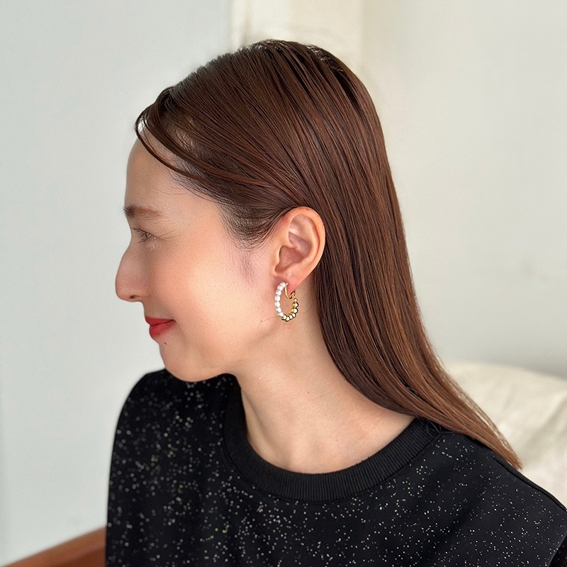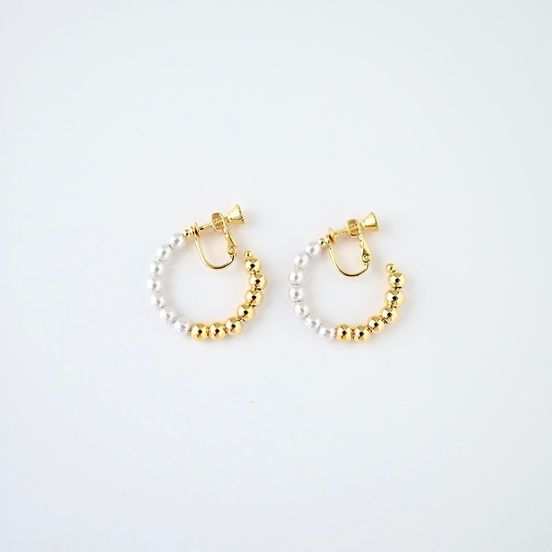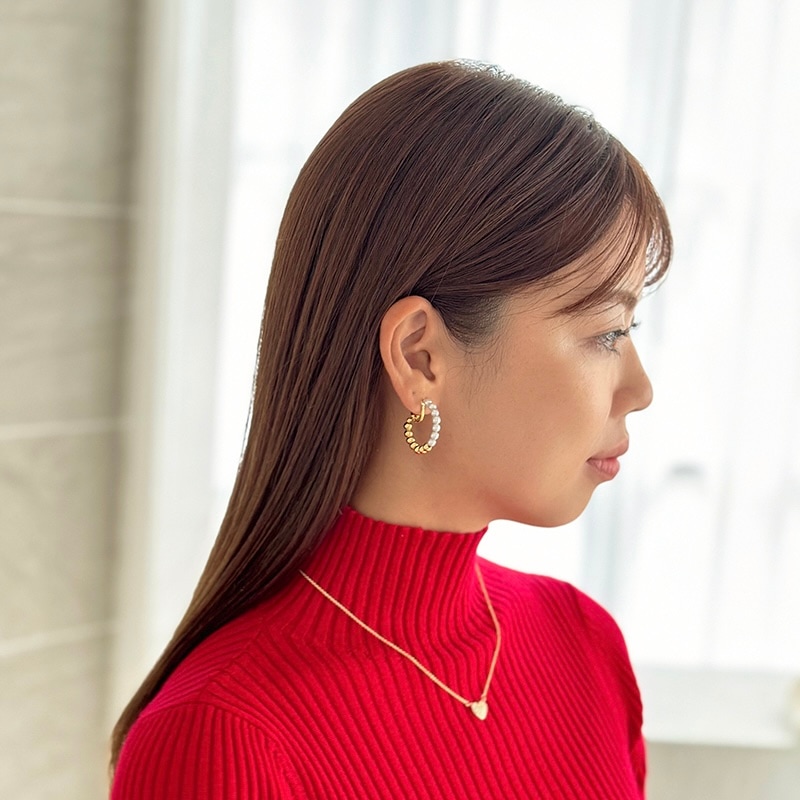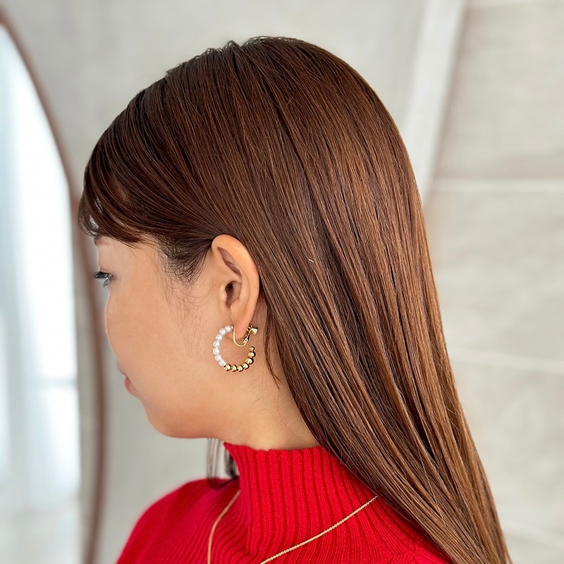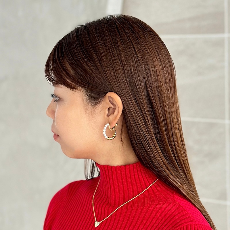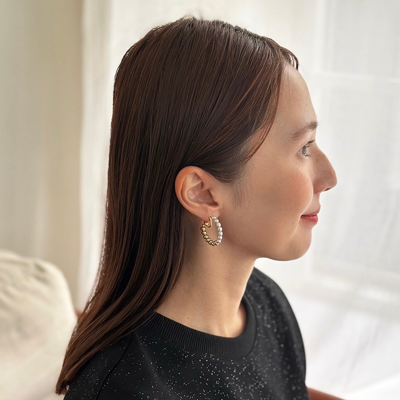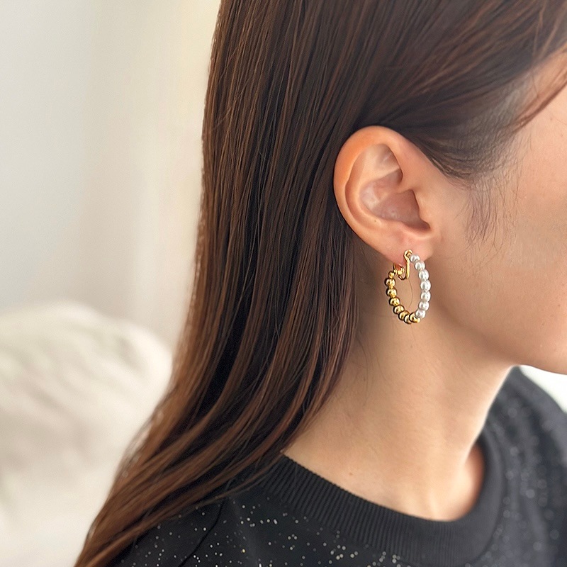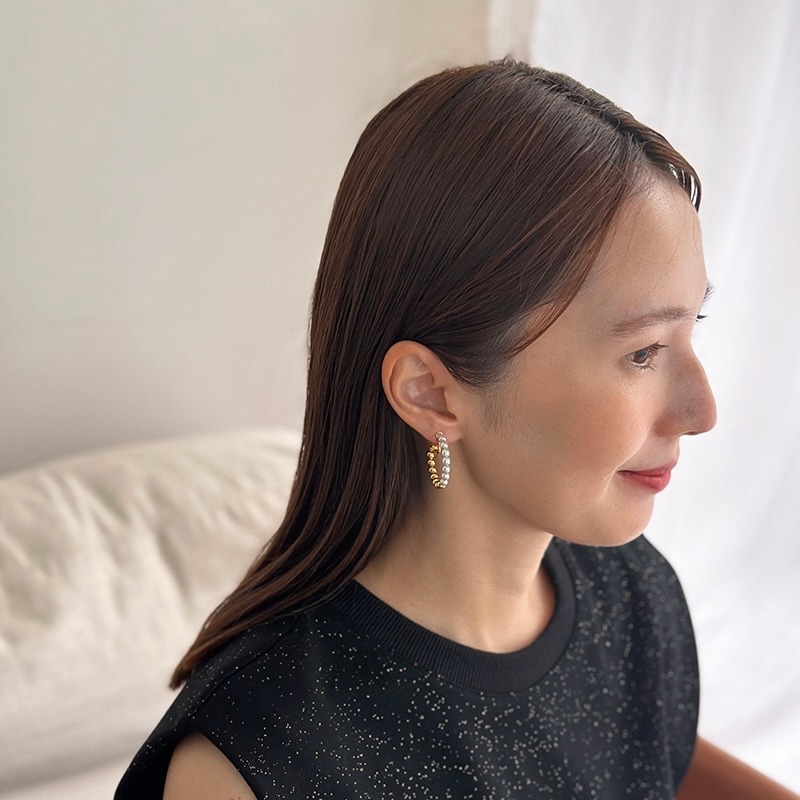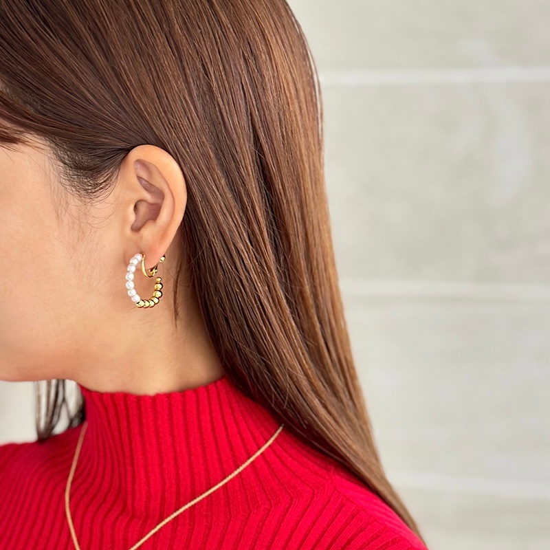パールとメタルのコンビネーションがカジュアルにも綺麗目にもモードにもお召しいただけるイヤリングです。
