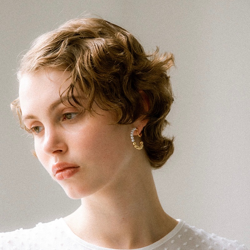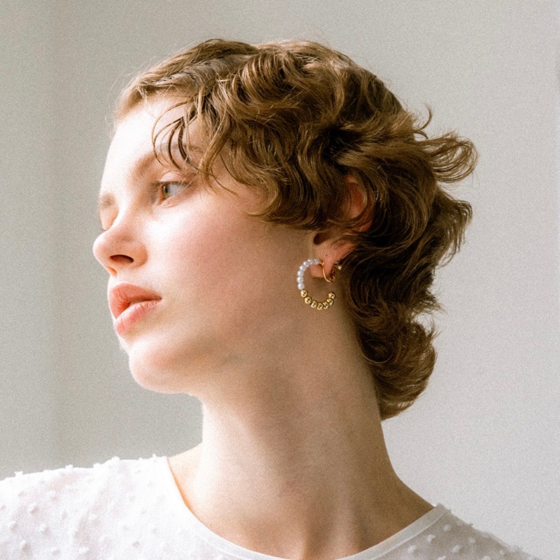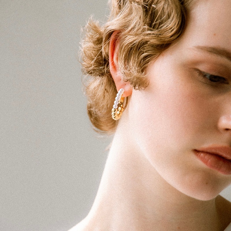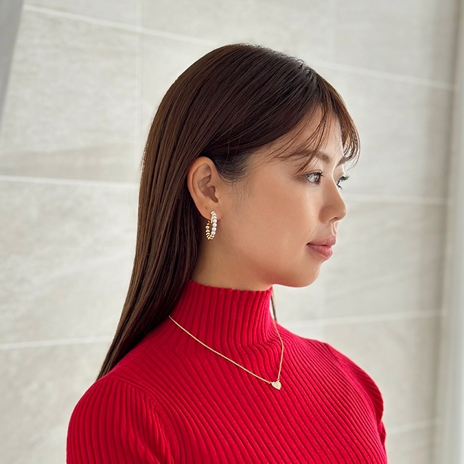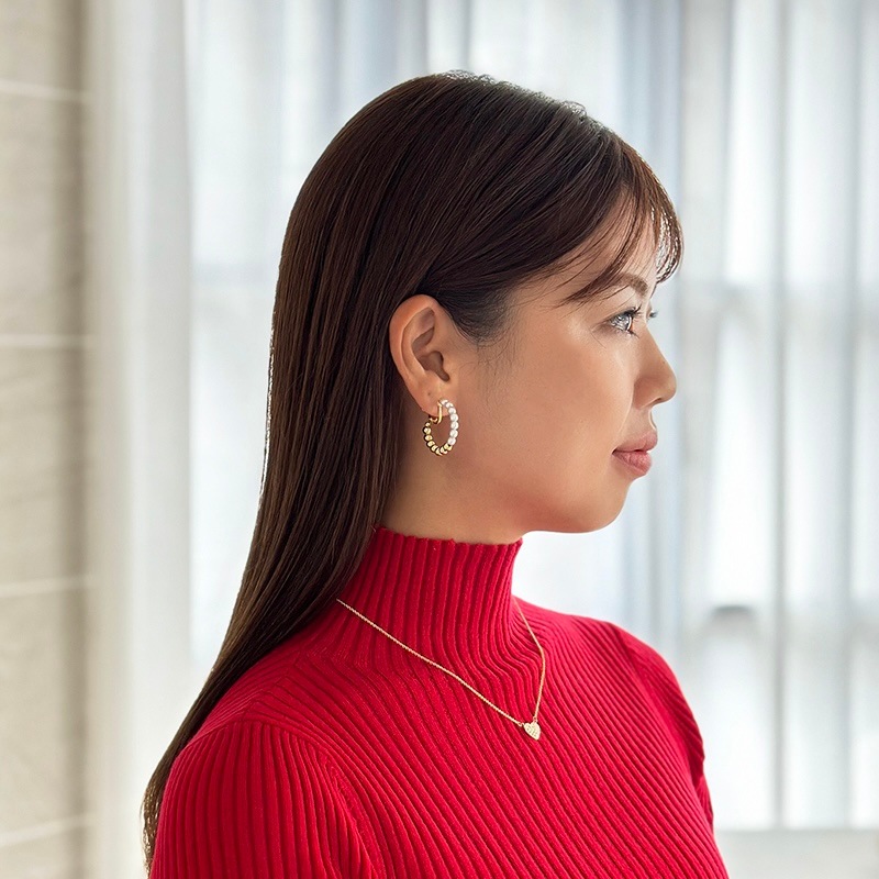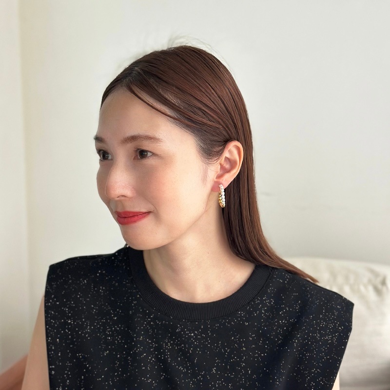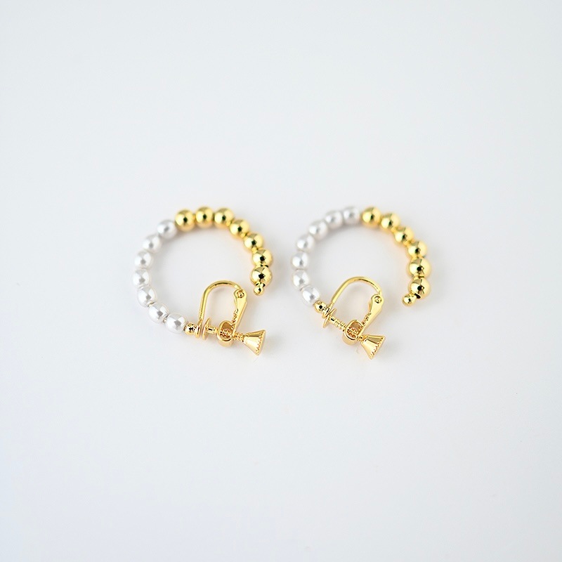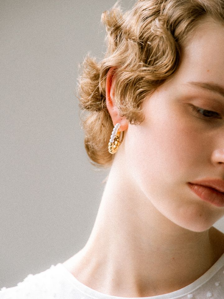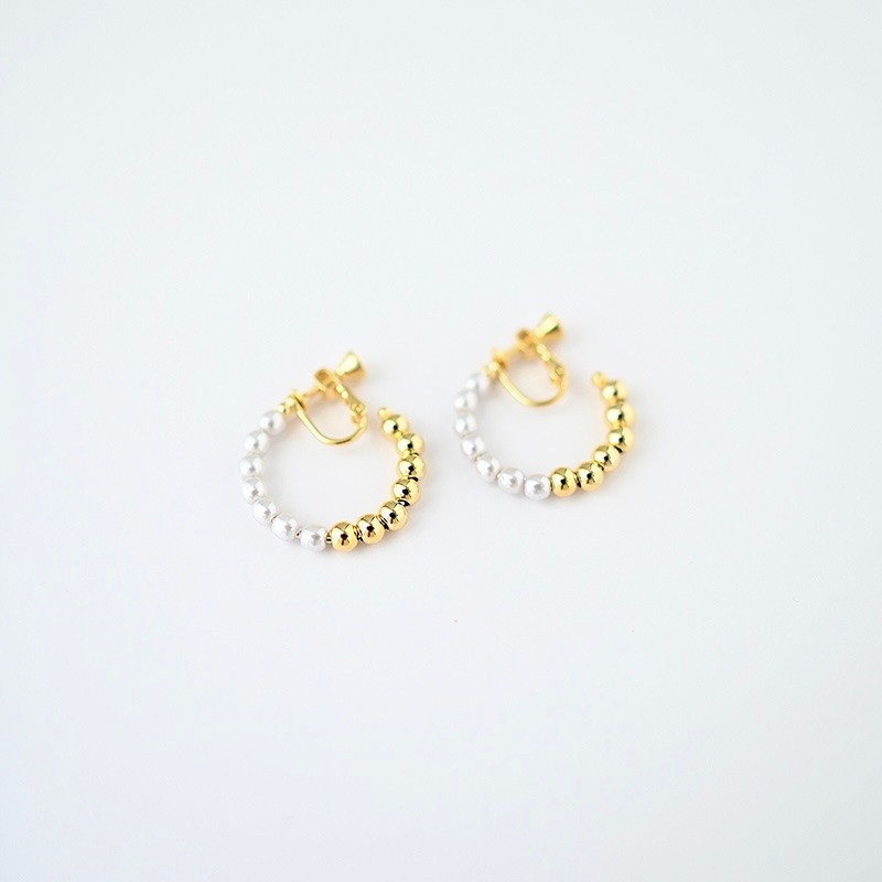 パールとメタルのコンビネーションがカジュアルにも綺麗目にもモードにもお召しいただけるイヤリングです。