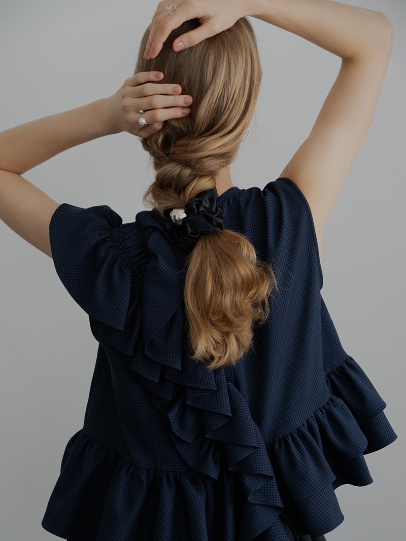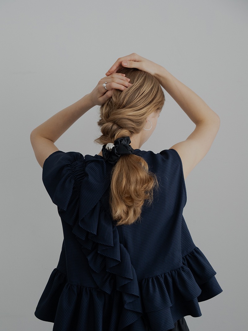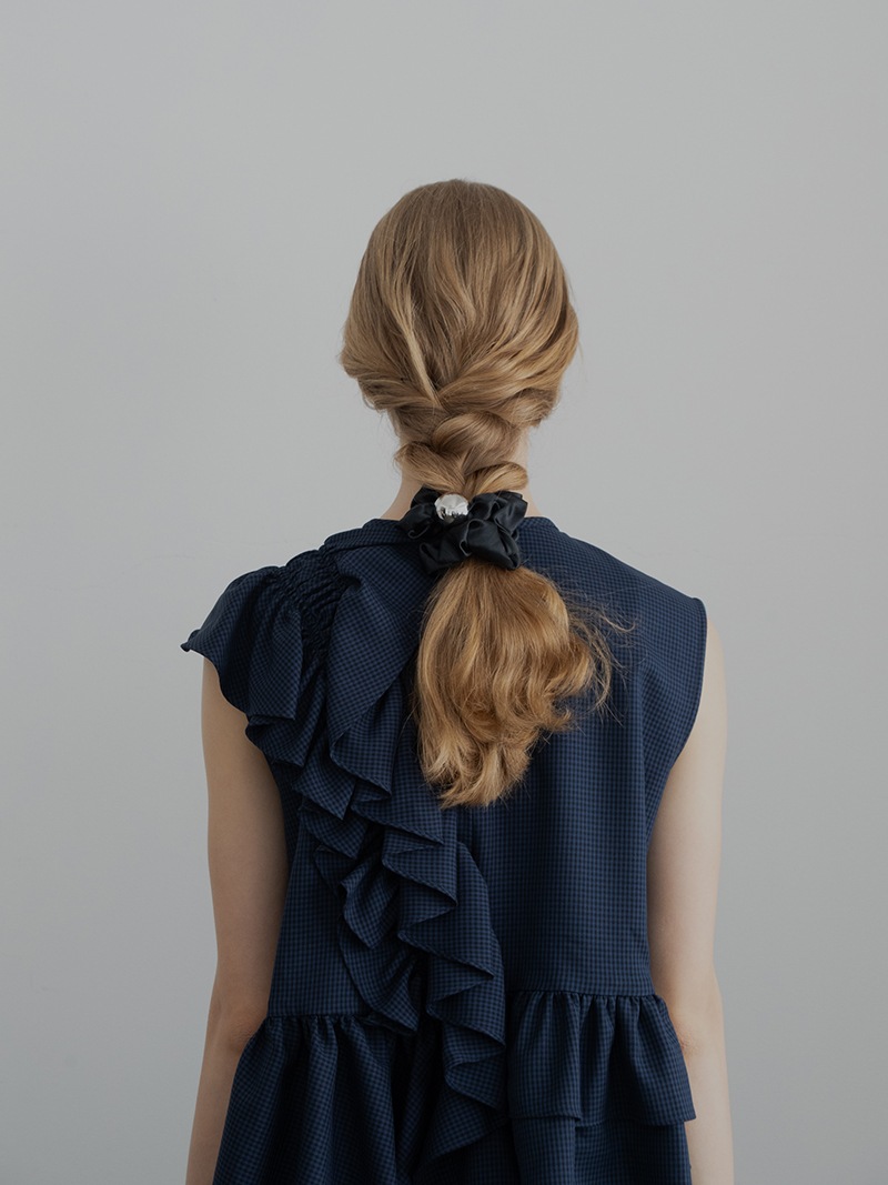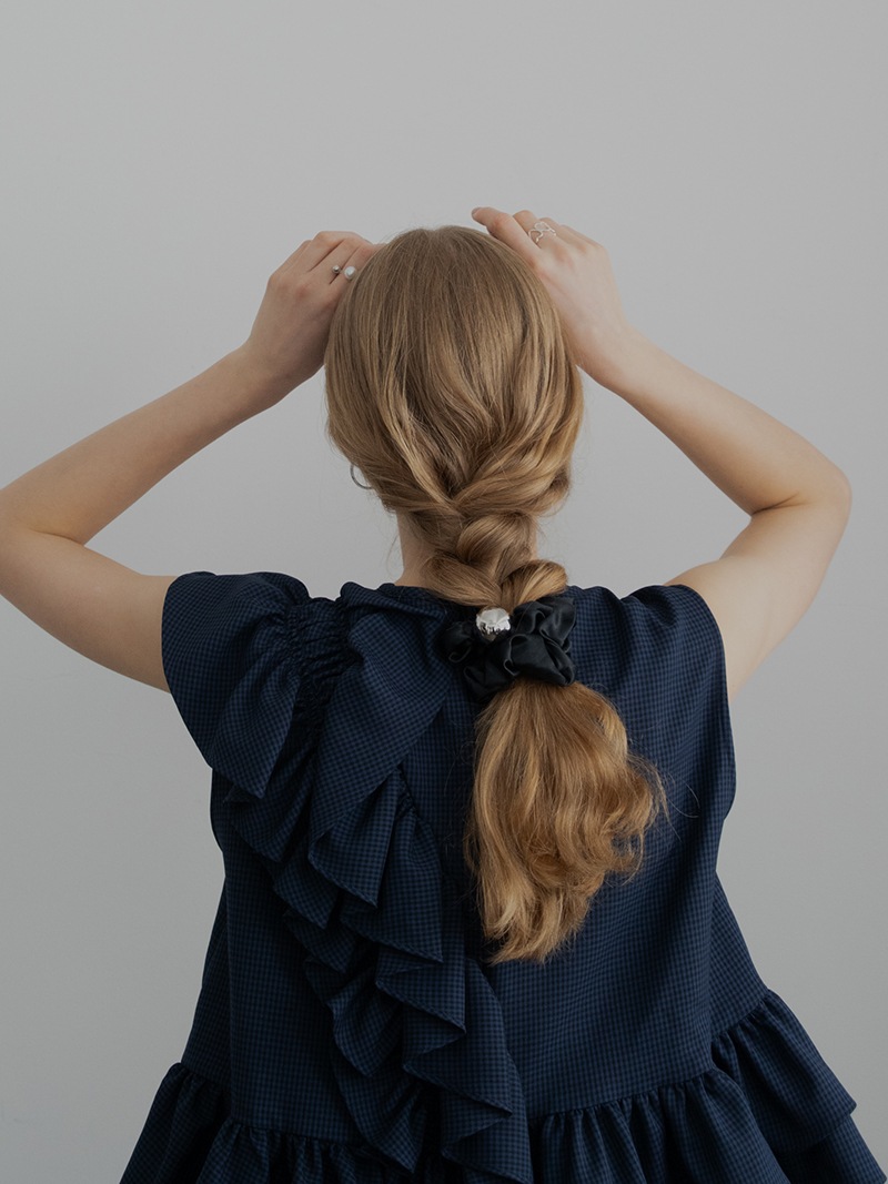 シュシュ部分らサテン生地を使用し、上品な中に輝きを放つボールモチーフがヘアスタイルを華やかに仕上げてくれます。