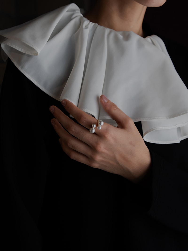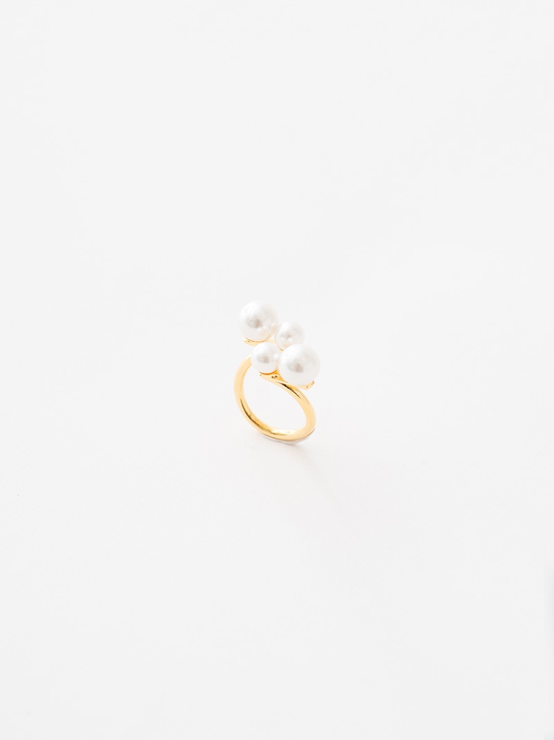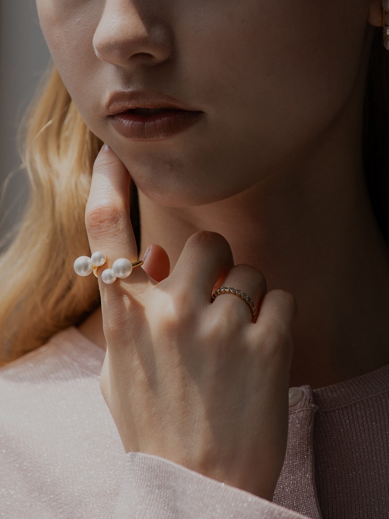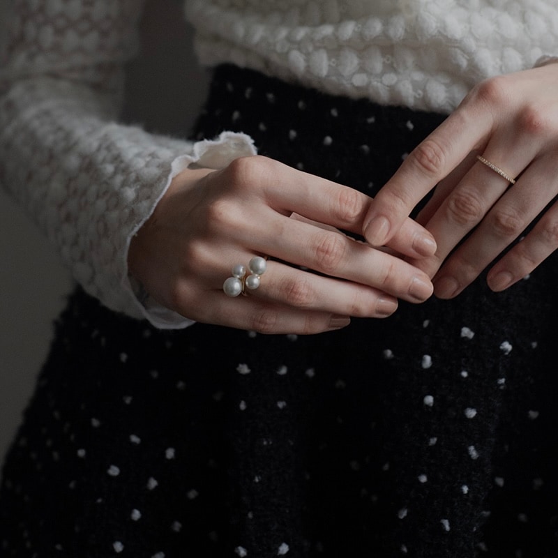 サイズの違うパールをあしらったシンプルな中に存在感のあるリングです。