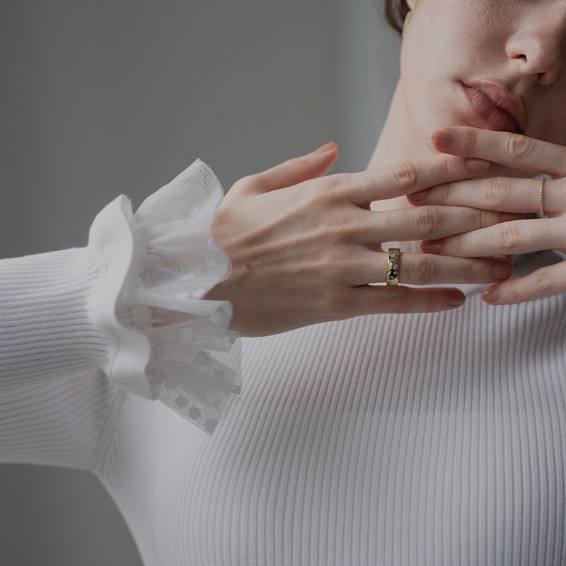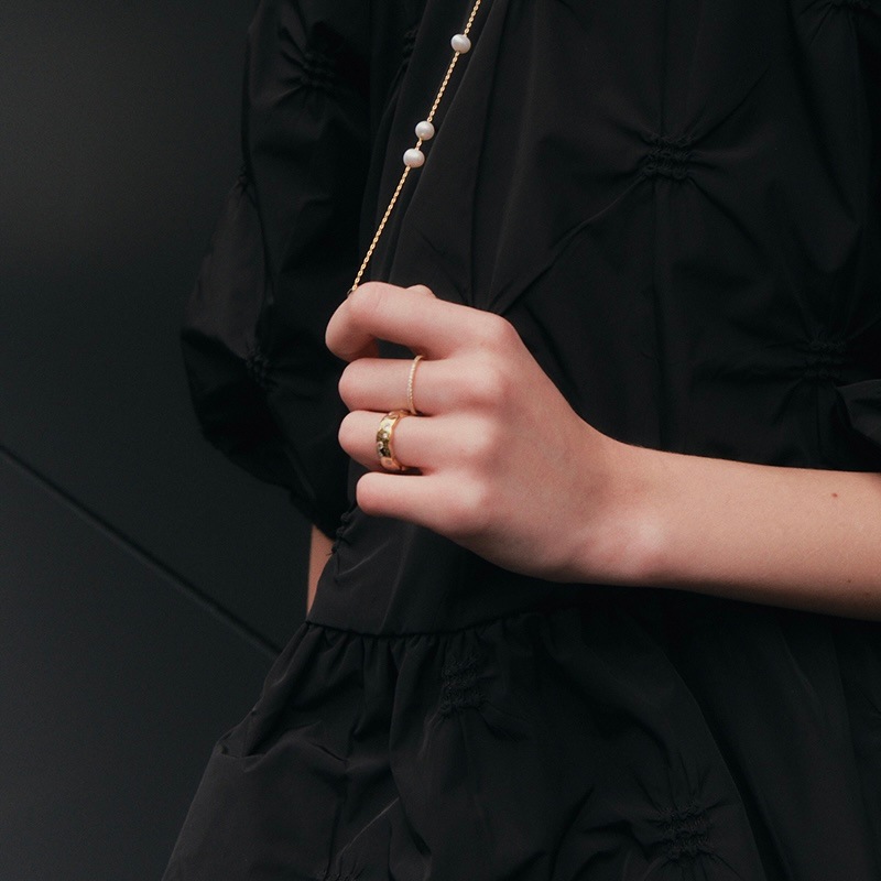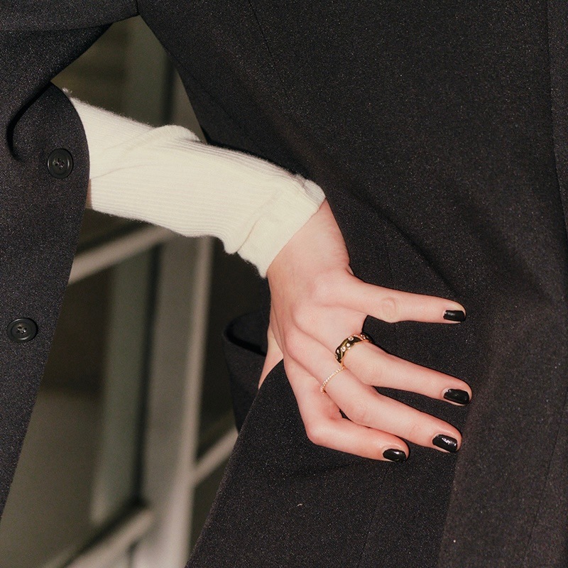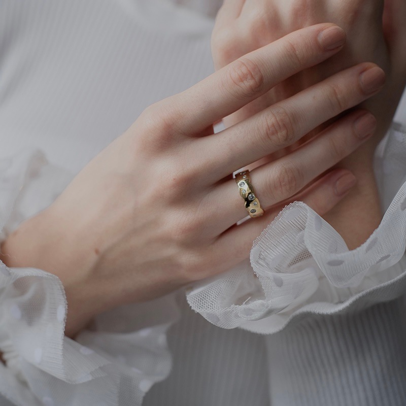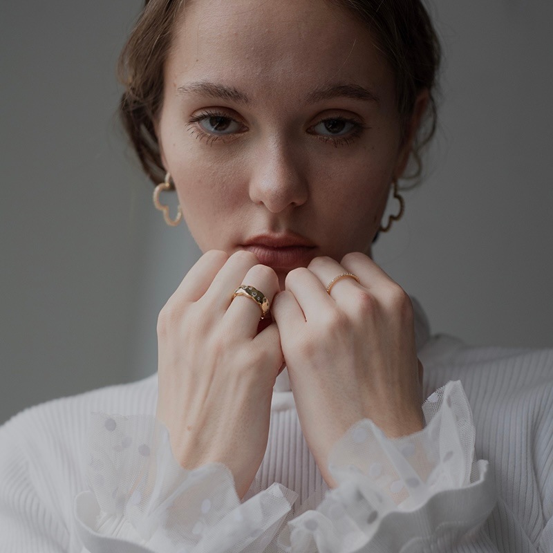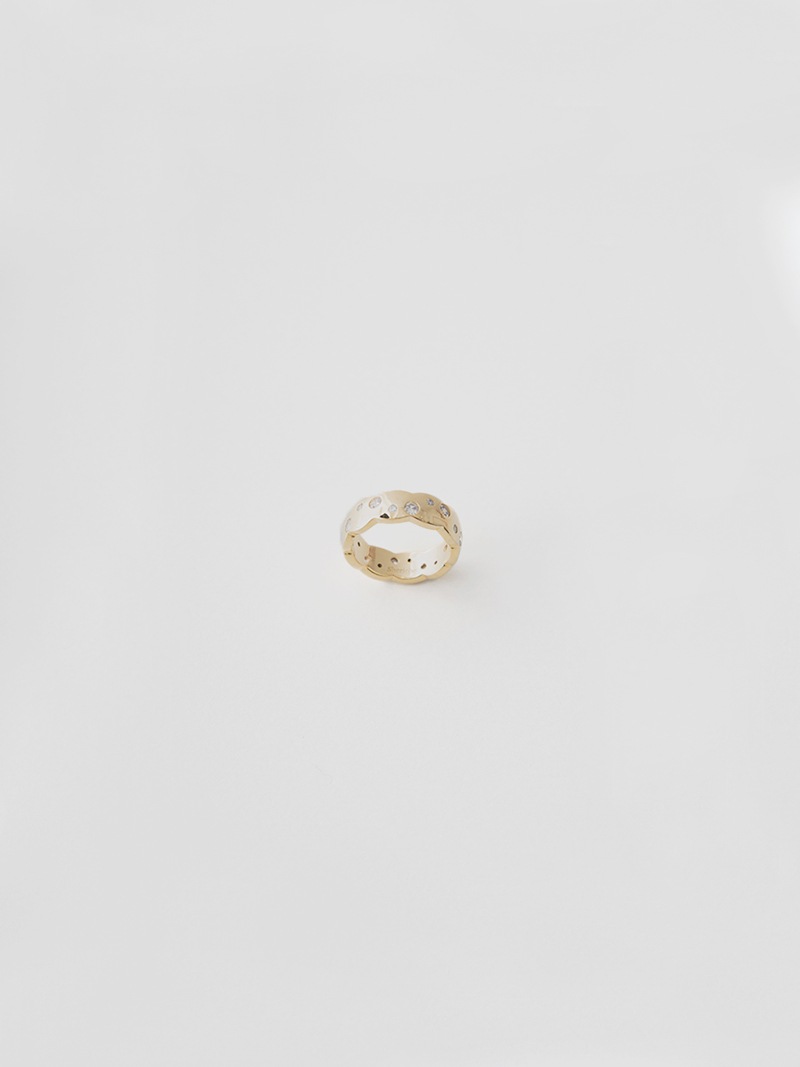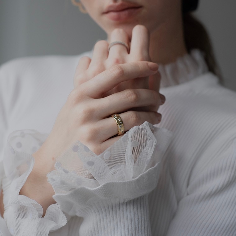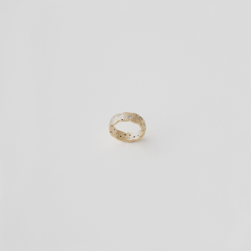 ボリュームのあるリングですが、スカラップが女性らしさを演出し、リングから放たれるストーンの輝きがカジュアルになりすぎないリングです。