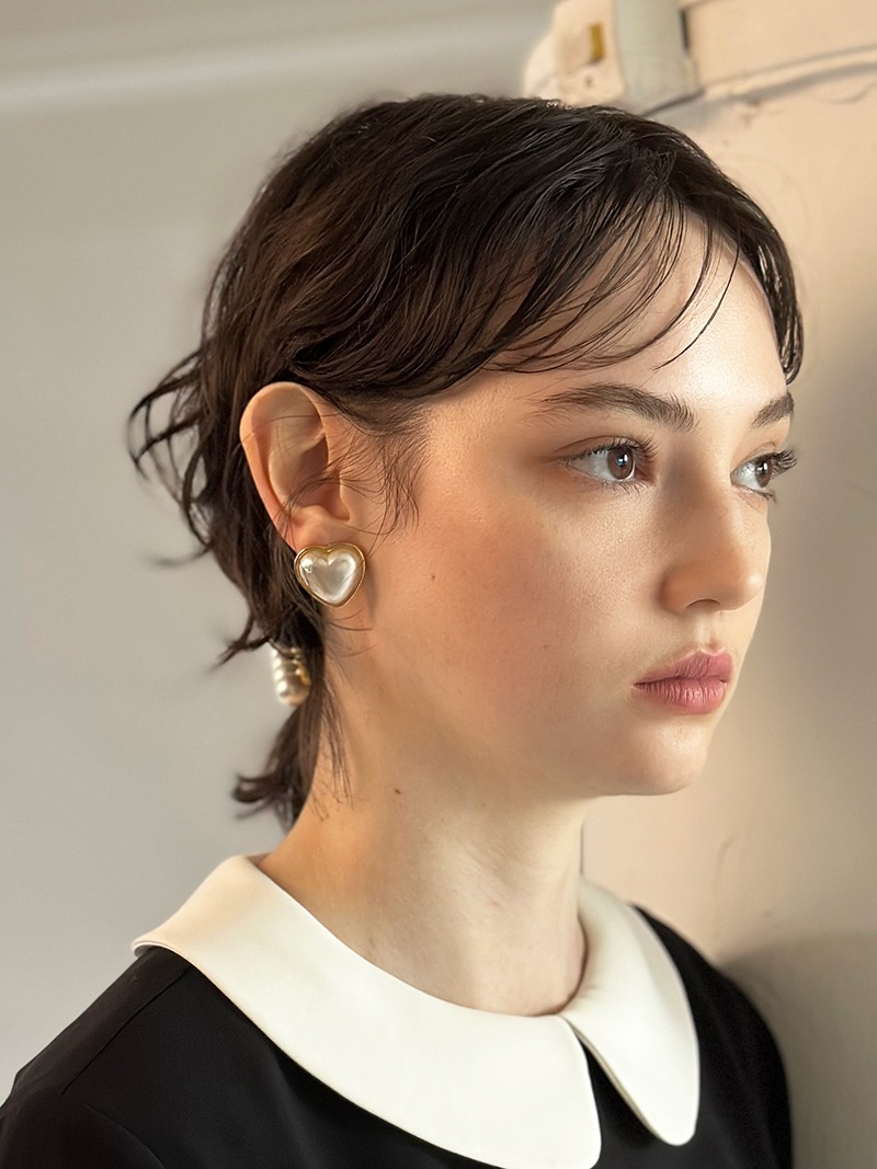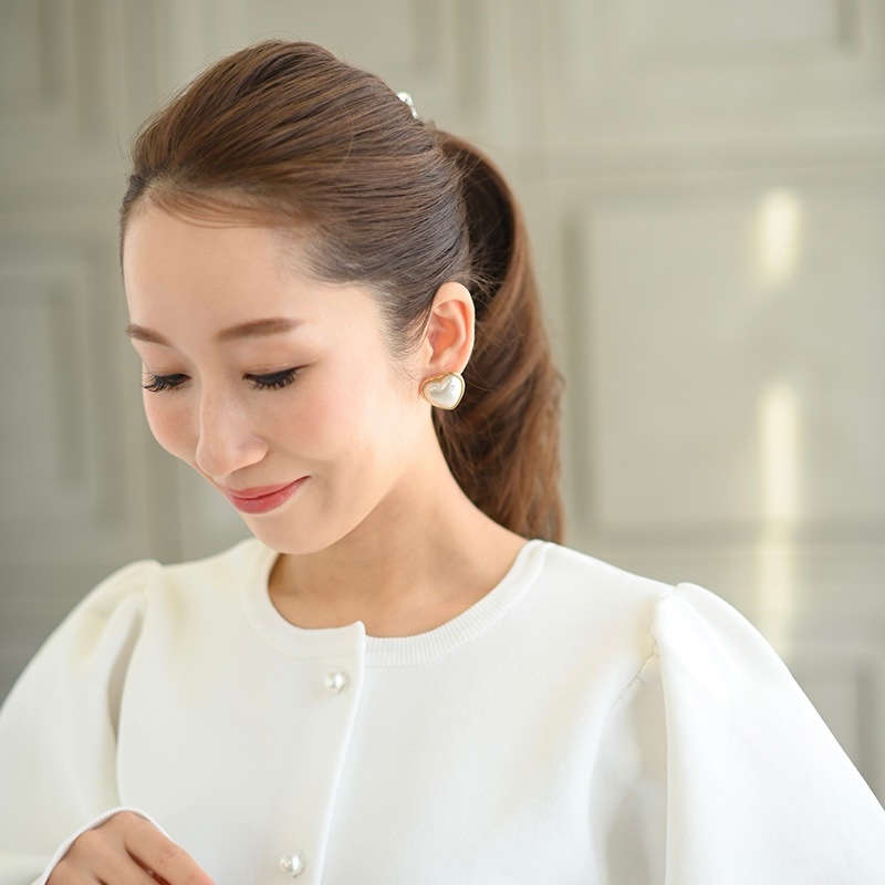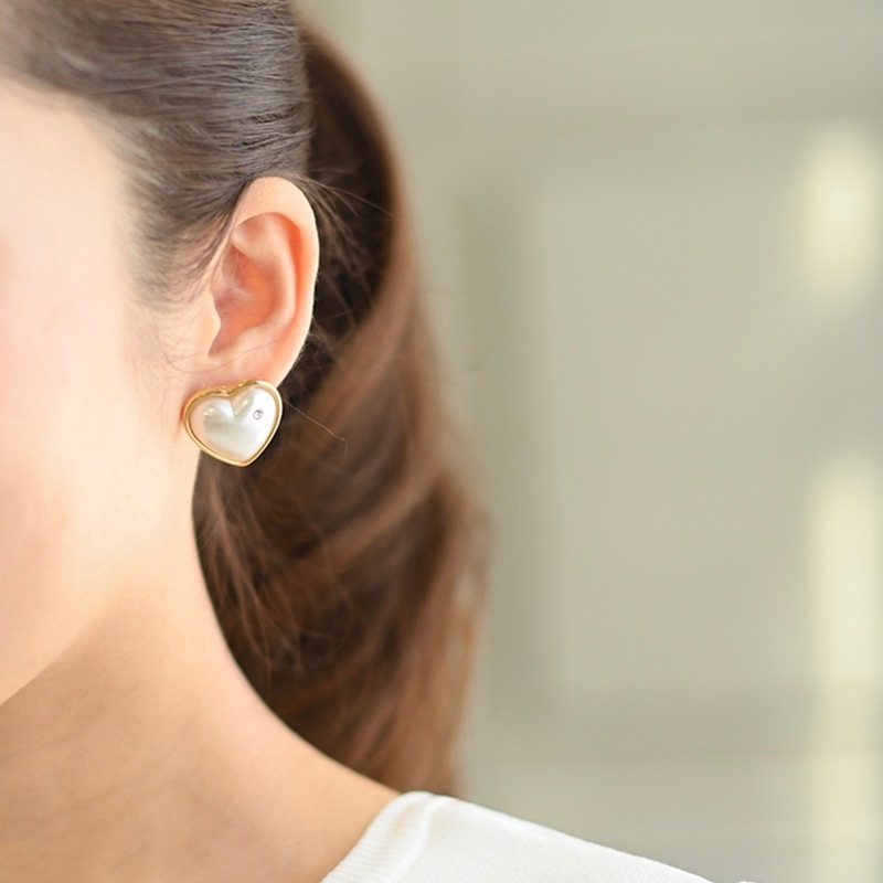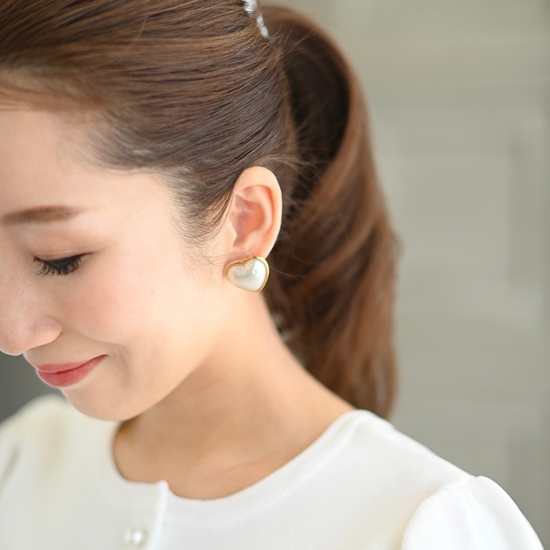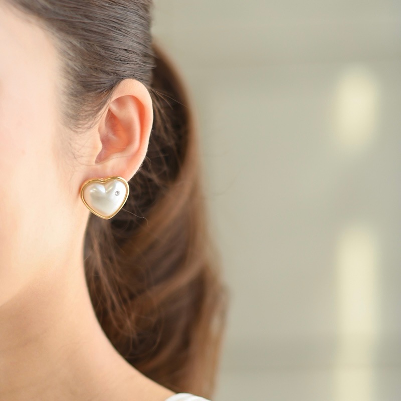 大粒のパールハートがコーディネートの主役になるようなイヤリングです。