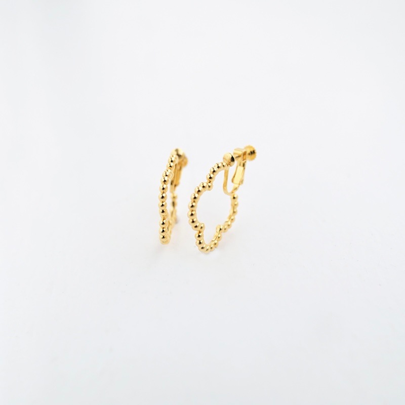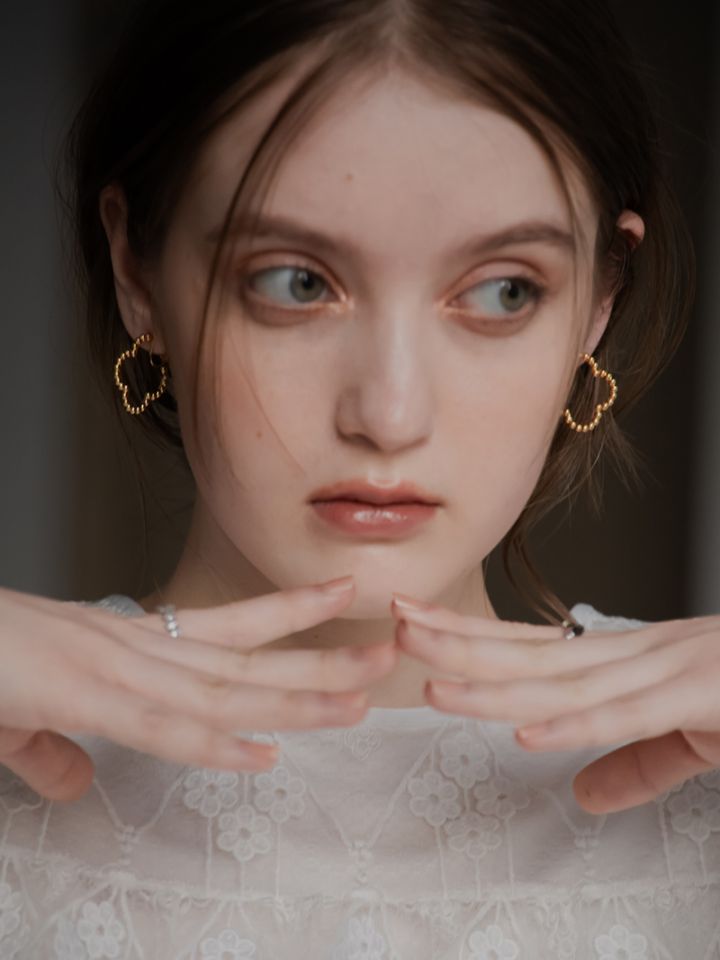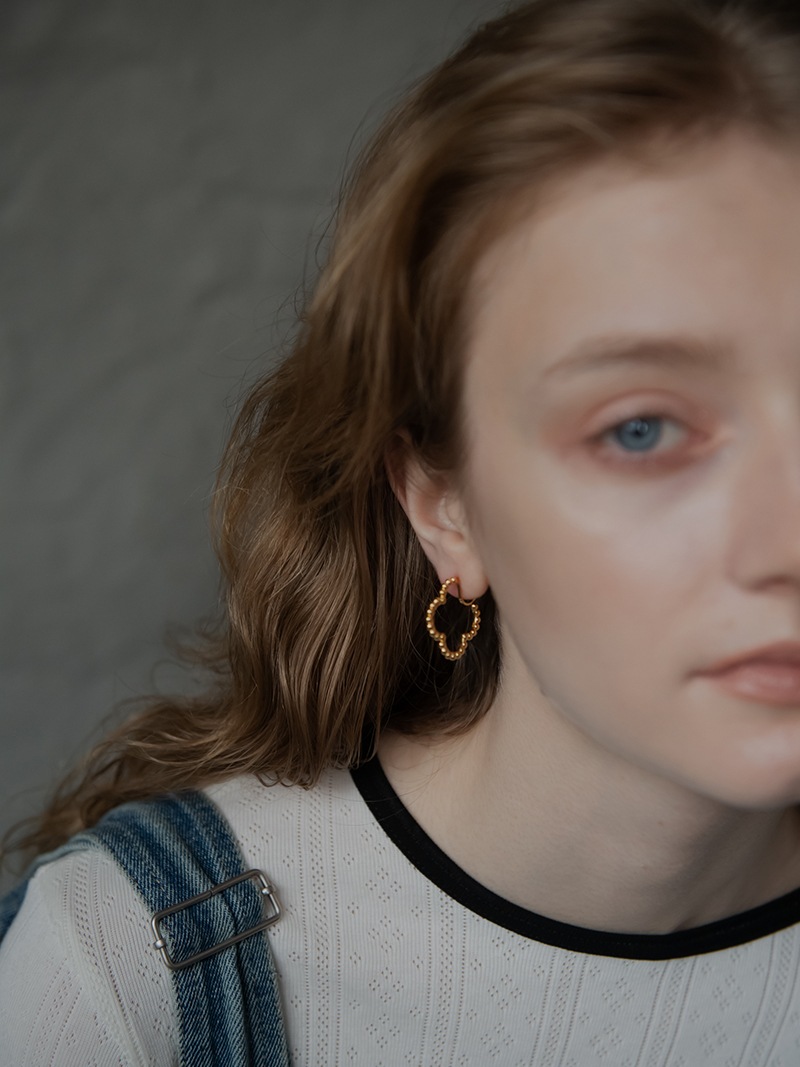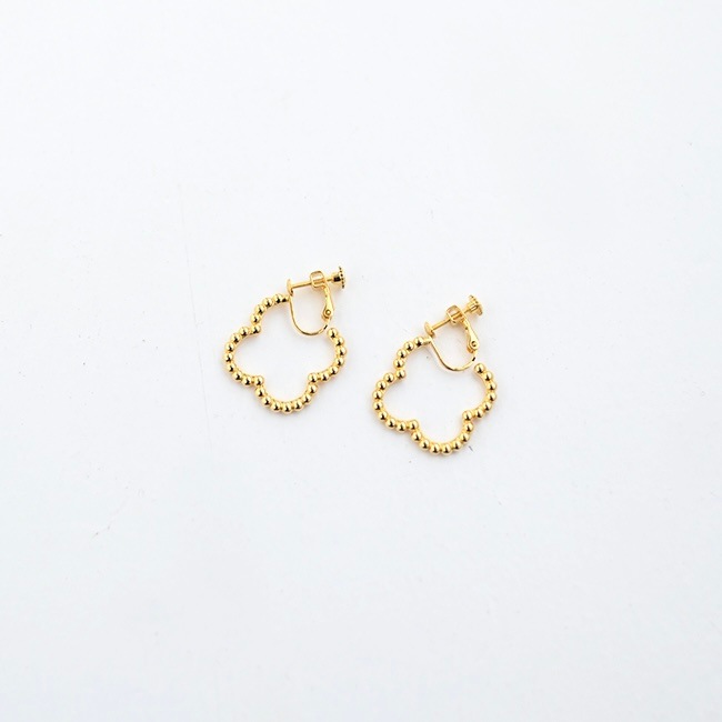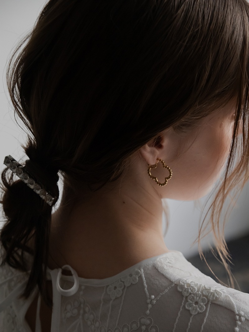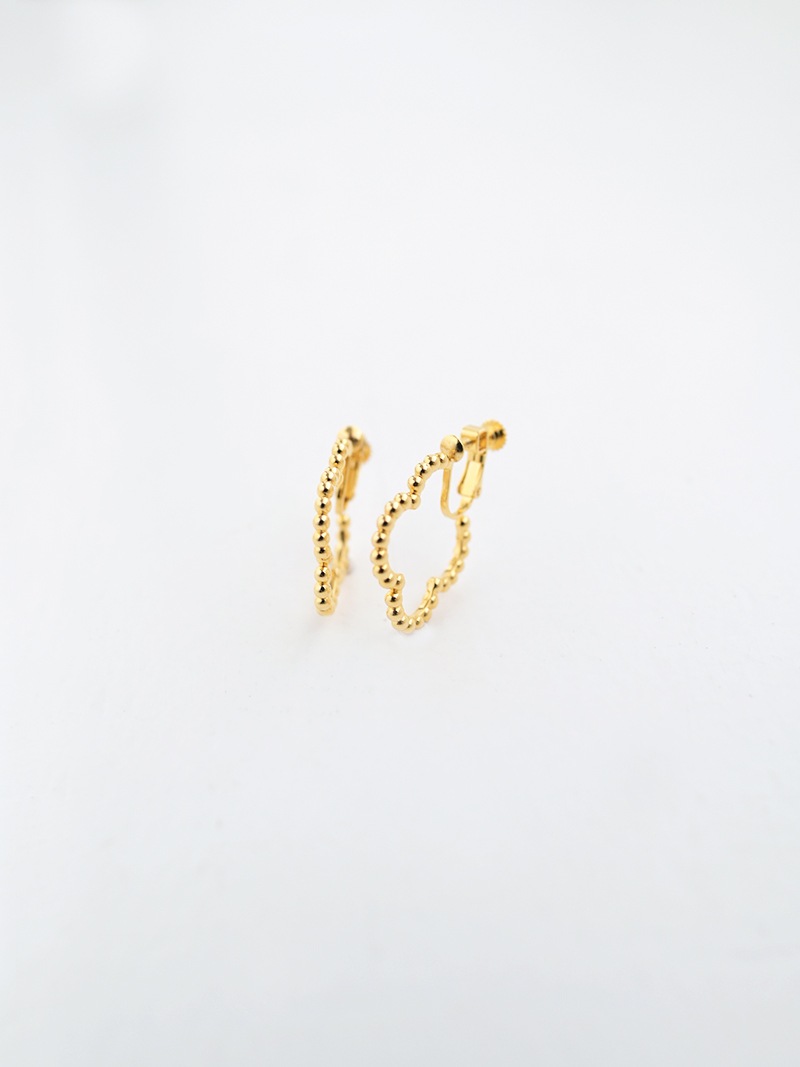 ドットをイメージした小さな丸玉がクローバーモチーフのフープ状に連なったシンプルでありながらお上品さもあるイヤリングです。