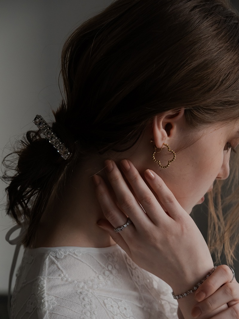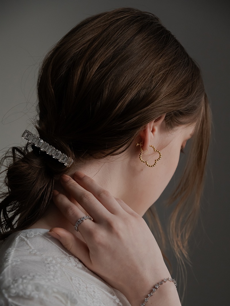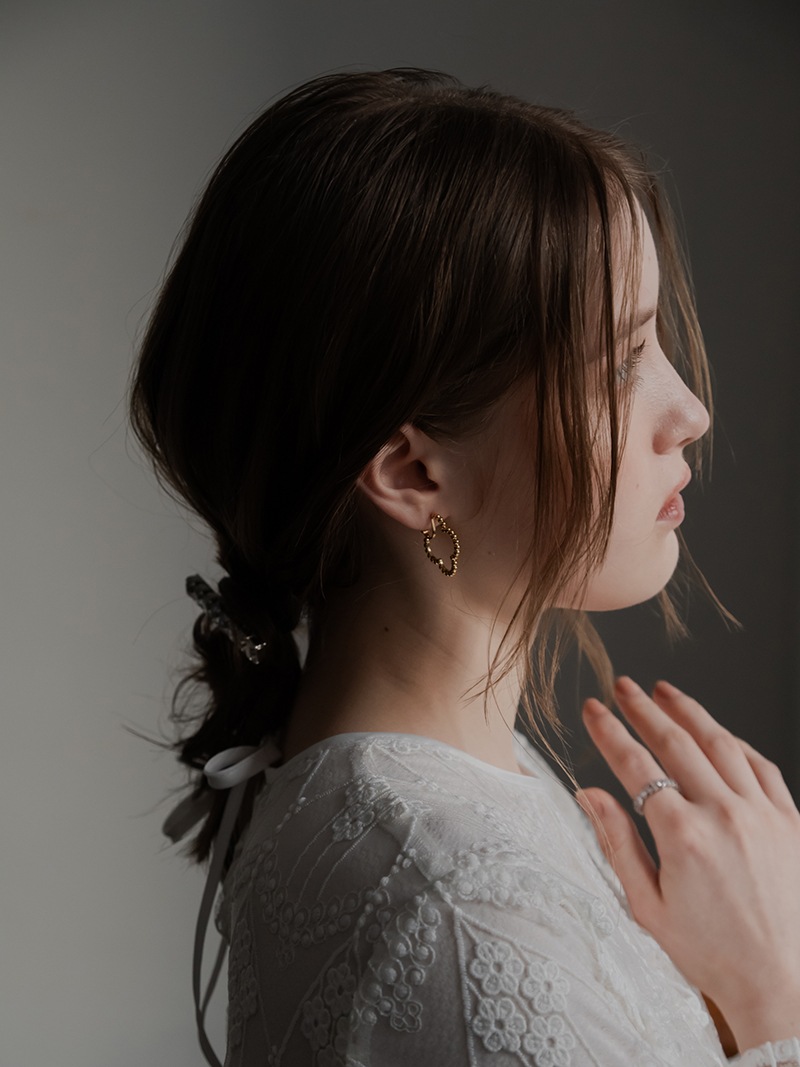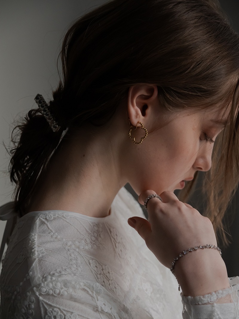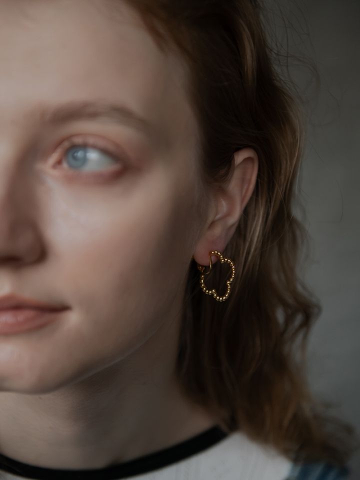 ドットをイメージした小さな丸玉がクローバーモチーフのフープ状に連なったシンプルでありながらお上品さもあるイヤリングです。