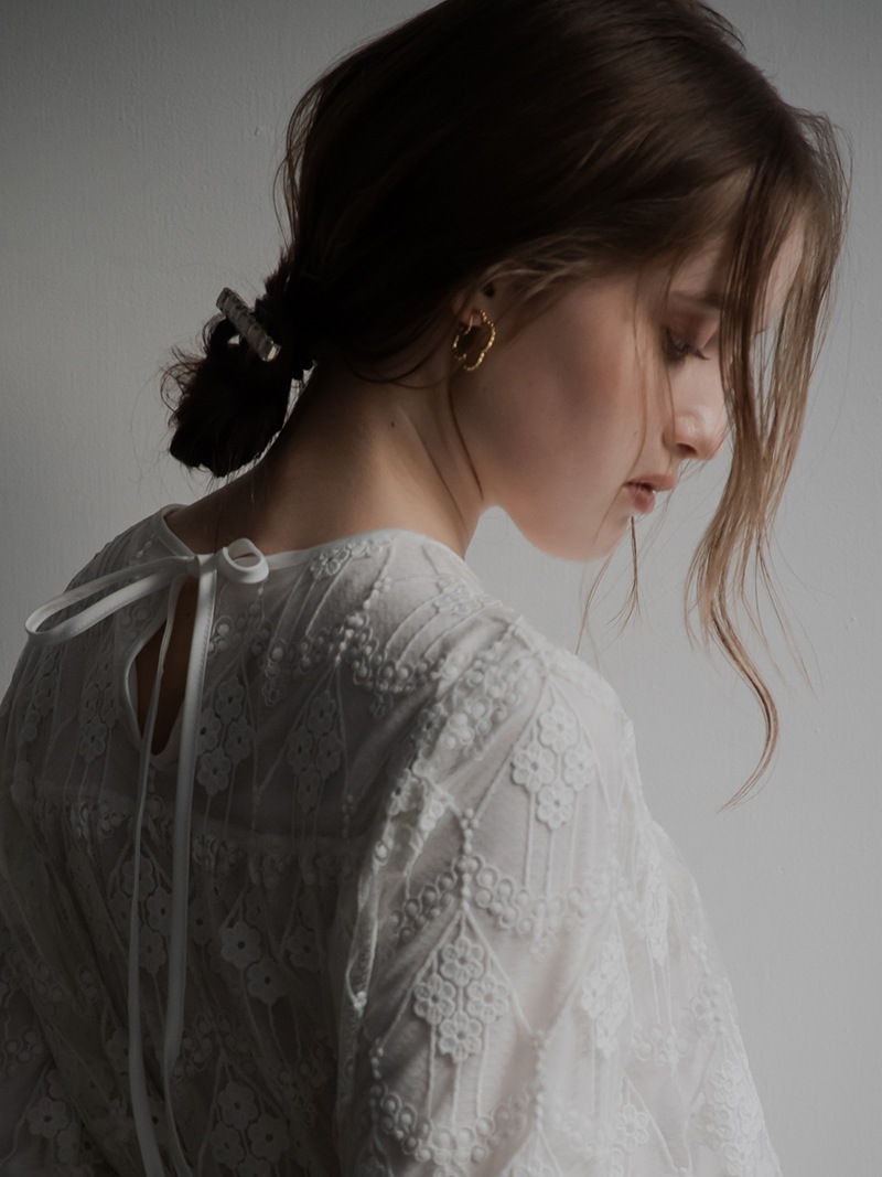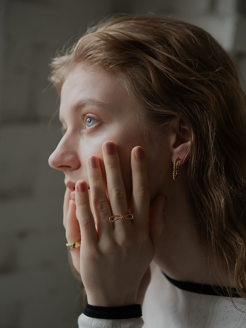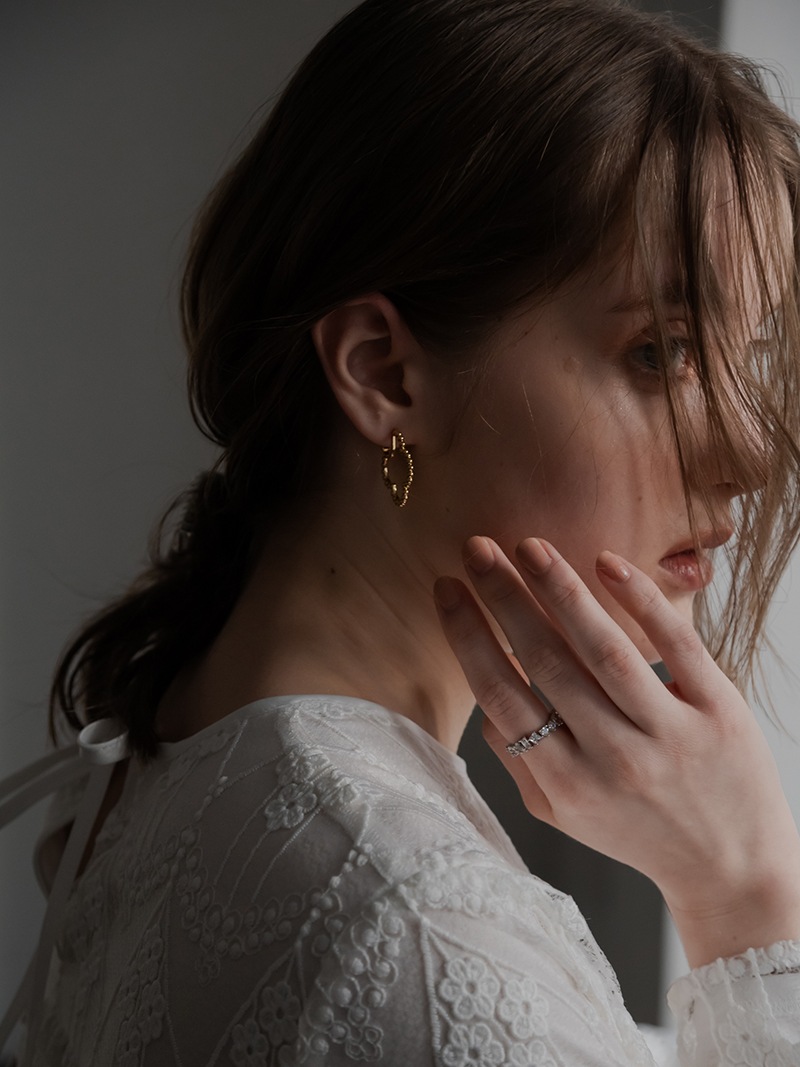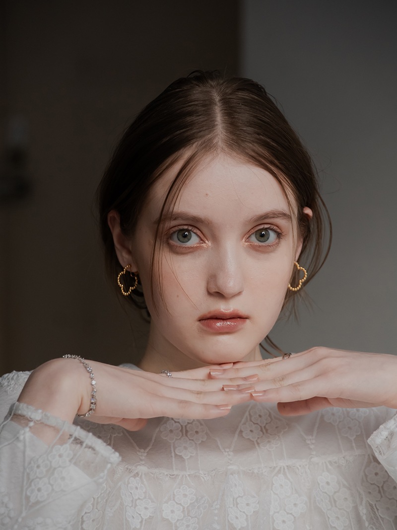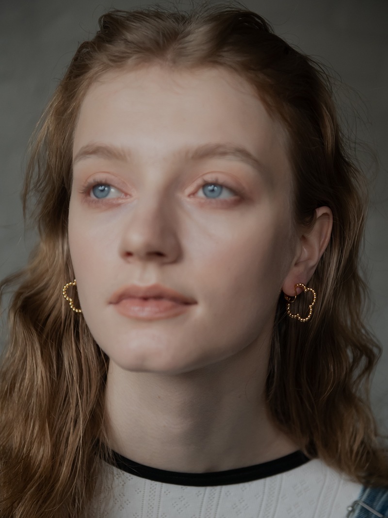 ドットをイメージした小さな丸玉がクローバーモチーフのフープ状に連なったシンプルでありながらお上品さもあるイヤリングです。