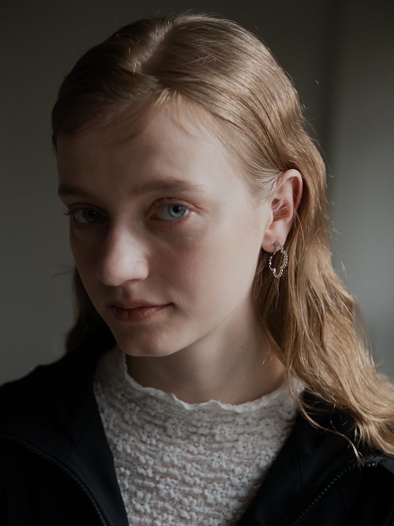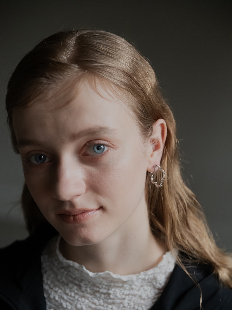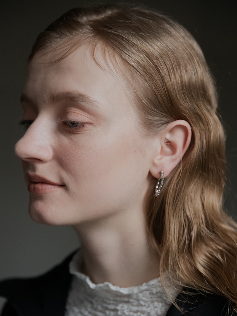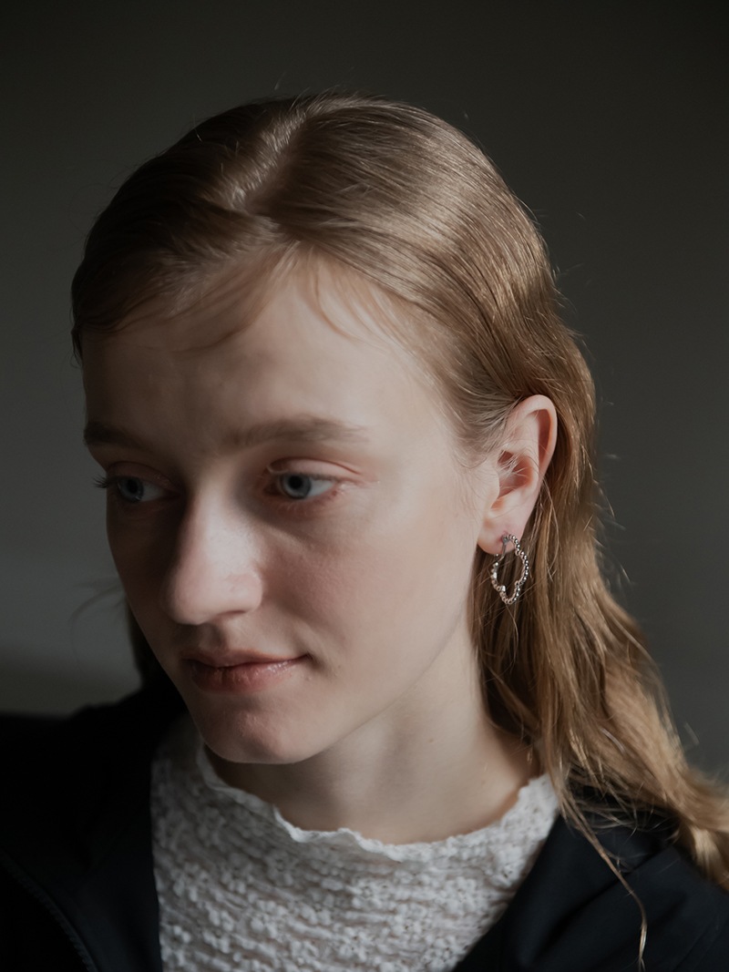 ドットをイメージした小さな丸玉がクローバーモチーフのフープ状に連なったシンプルでありながらお上品さもあるイヤリングです。